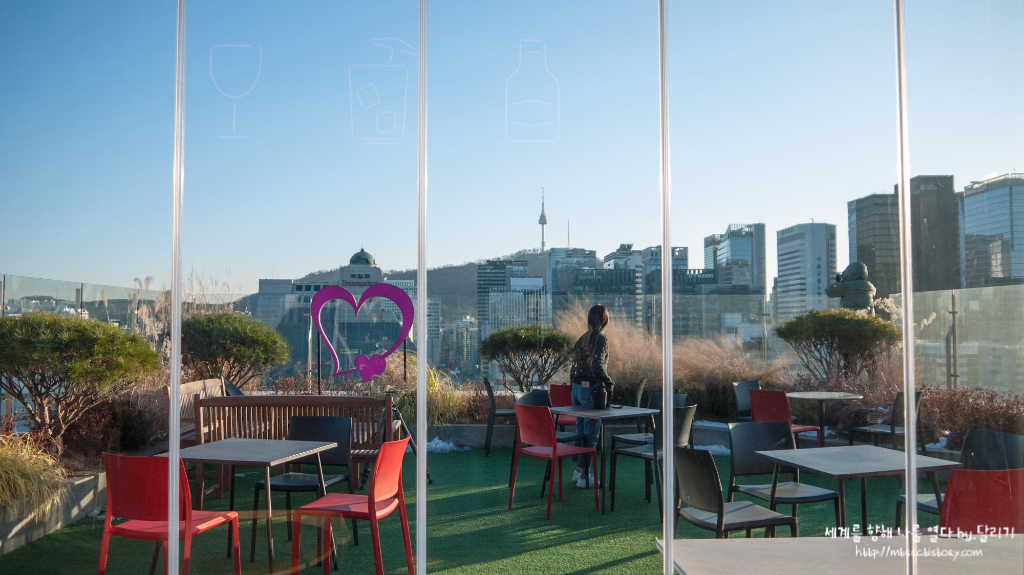 16층으로 올라오니 바로 앞에 체크인 하는 곳이 있었어요. 먼저 체크인하고 계신 투숙객들이 있어서 사진은 찍지 못했습니다. 그리고 그 옆으로는 예쁜 루프탑 라운지가 있었습니다. 넓은 공간은 아니지만 야외 공간 덕분에 개방감이 있어서 분위기는 좋았습니다. 뷰도 남산 타워 쪽이라서 예뻤고요. 이 날은 날씨가 매우 추워서 야외에서 뭘 하고 싶다는 생각이 1도 들지 않았지만, 날씨 좋을 때 오면 엄청 좋을 것 같았어요.