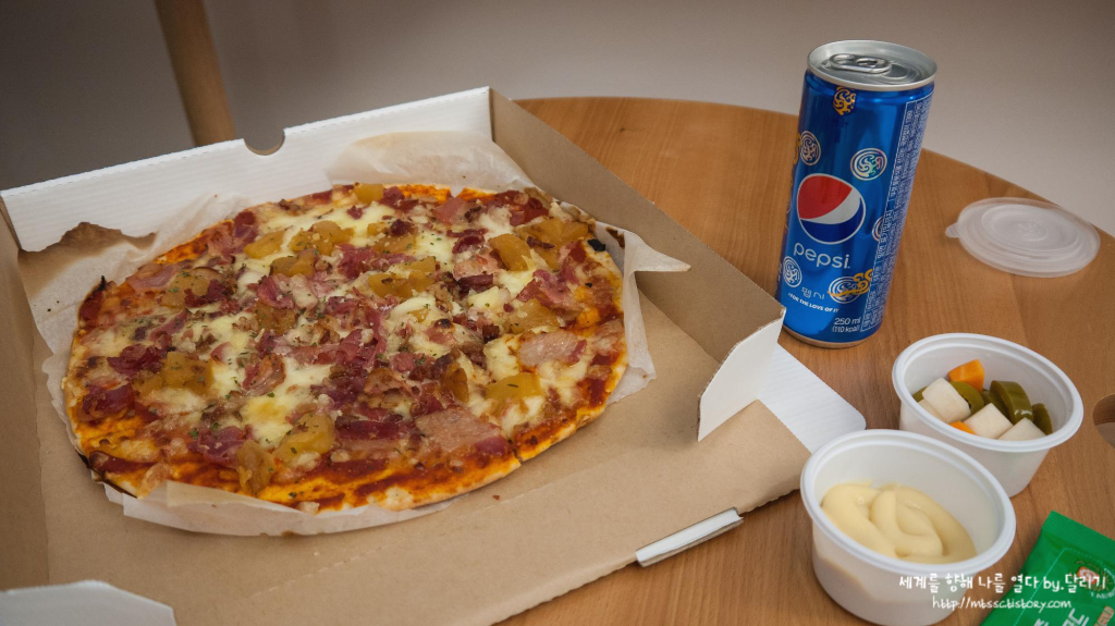 가습기와 함께 16층 루프탑에서 받아온 피자에요. 베이컨과 파인애플이 들어간 하와이안 피자였습니다. 마실 것도 루프탑 바에서 사려고 했는데 여기서 파는 음료들은 바에서 마실 손님들을 위한 거라 가격이 많이 비싼 편이더라고요. 그래서 2층 자판기에서 콜라를 하나 뽑아왔어요.