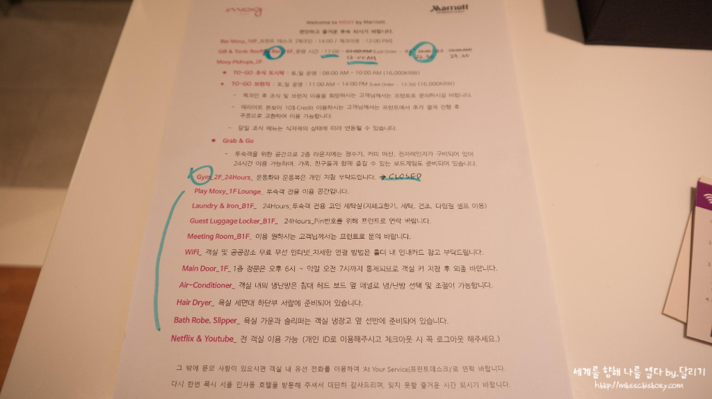 대충 방을 다 둘러본 다음에, 체크인 하면서 받은 안내지를 쭉 읽어봅니다. 어, 여기에 호텔 내 시설 이용 관련 안내 사항 외에도 와이파이나 냉난방, 헤어드라이기 위치 등이 다 안내되어 있었네요. 냉난방 조절기와 헤어드라이기를 한참 동안 찾았는데 말입니다 흑흑....... 머리가 나쁘면 몸이 고생해요. ㅜㅜ 아무튼 콤팩트 한 공간을 알차게 활용하고 있다 보니 뭐가 여기저기 잘 숨겨져 있는데, 이렇게 친절하게 안내를 해주고 있었습니다.