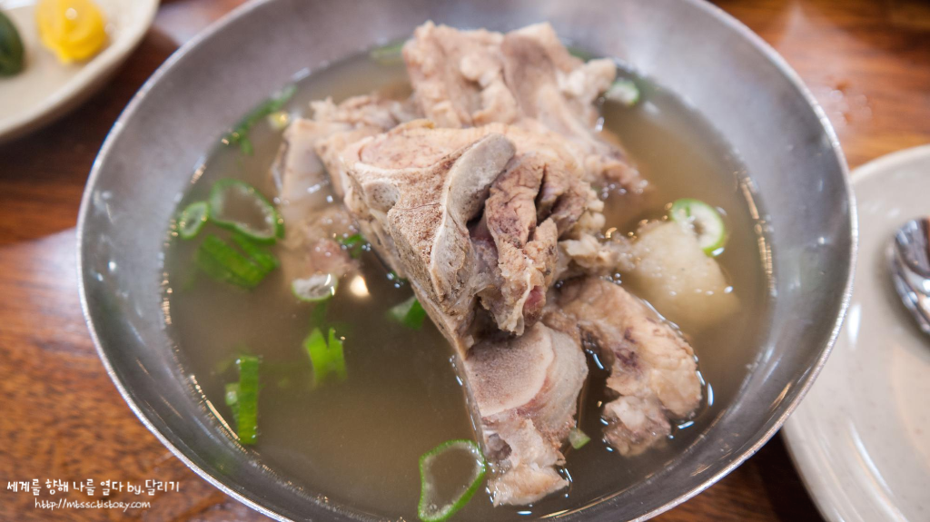 뼛국 여러 반찬들과 함께 뼛국이 제공됩니다. 별도로 주문해야 나오는 메뉴가 아니라 기본으로 제공되는 메뉴예요! 송정 떡갈비 식당들 대부분은 이렇게 뼛국을 제공한다고 합니다.