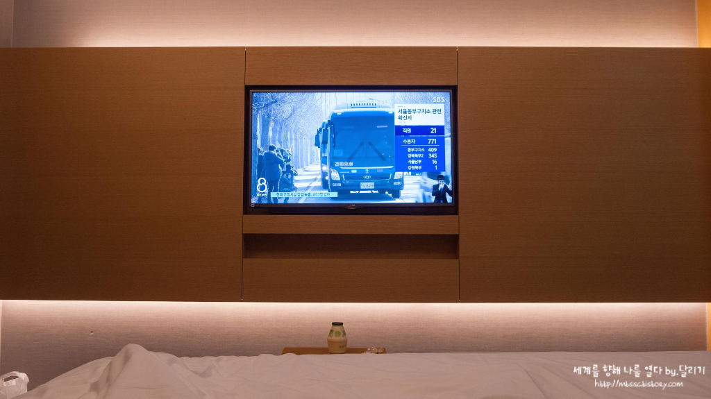 TV는 크지는 않았지만 침대 바로 앞에 있어서 불편한 건 없었어요.