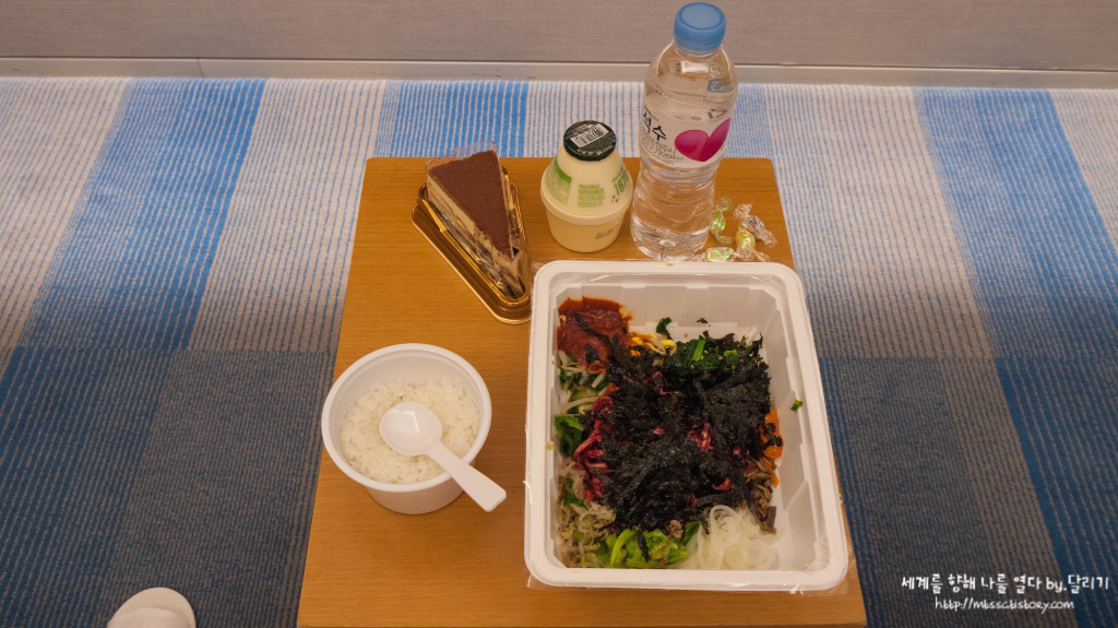 새벽집에서 포장해 온 육회비빔밥과 호텔 옆 편의점에서 사 온 티라미수와 뚱바, 그리고 호텔 로비에서 무료로 가져올 수 있는 사탕들 ㅋㅋㅋ 이게 이 날 제 저녁이었어요 :D