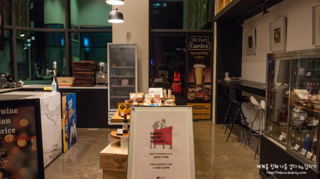 Re:Fuel 밖에 있는 식당에 가서 음식을 포장해오려고 나오는데, 로비에 있는 Re:fuel이라는 공간이 있었어요. 생각해보니 4년 전 첫 투숙 때도 여길 이용했었는데 왜 여기서 먹을 걸 사 먹을 생각을 못했나 싶었어요. 그렇지만 제가 갔을 땐 이미 2시간 전에 문을 닫았더라고요(...).