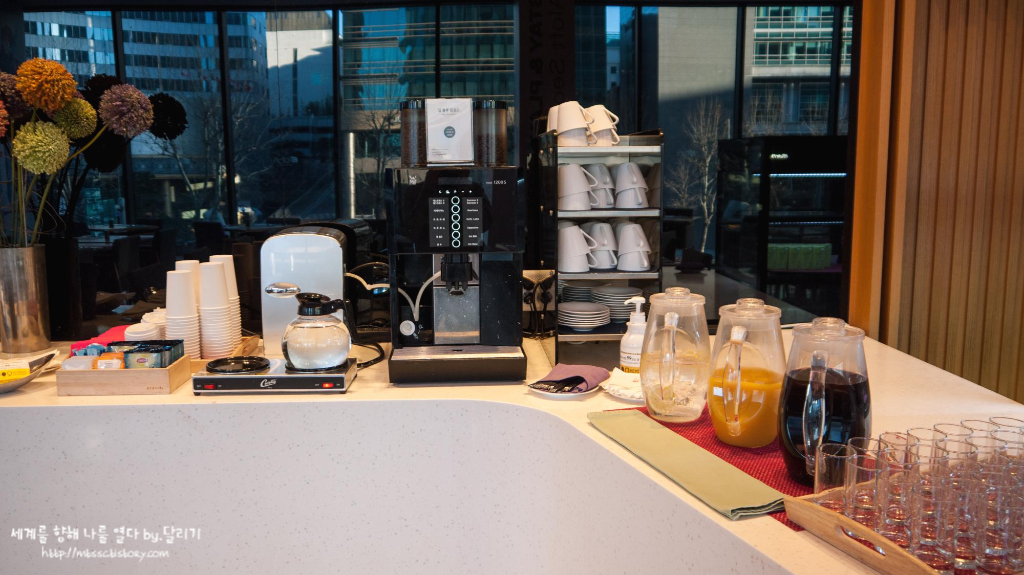 커피나 티, 주스 정도는 마음껏 가져다 마실 수 있도록 해두었습니다. 저는 오렌지 주스만 열심히 가져다 마셨네요.