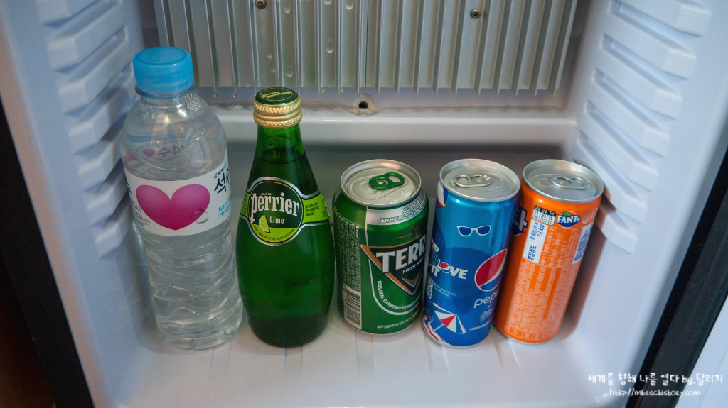 냉장고를 열어보니 미니바도 운영하고 있습니다. 이 정도 이코노미 계열의 호텔들은 미니바는 운영을 잘 안 하던데, 신기하더라고요. 물론 신기하다고 해서 꺼내 먹지는 않았습니다 ㅎㅎ 바로 옆에 편의점이 있어요!!