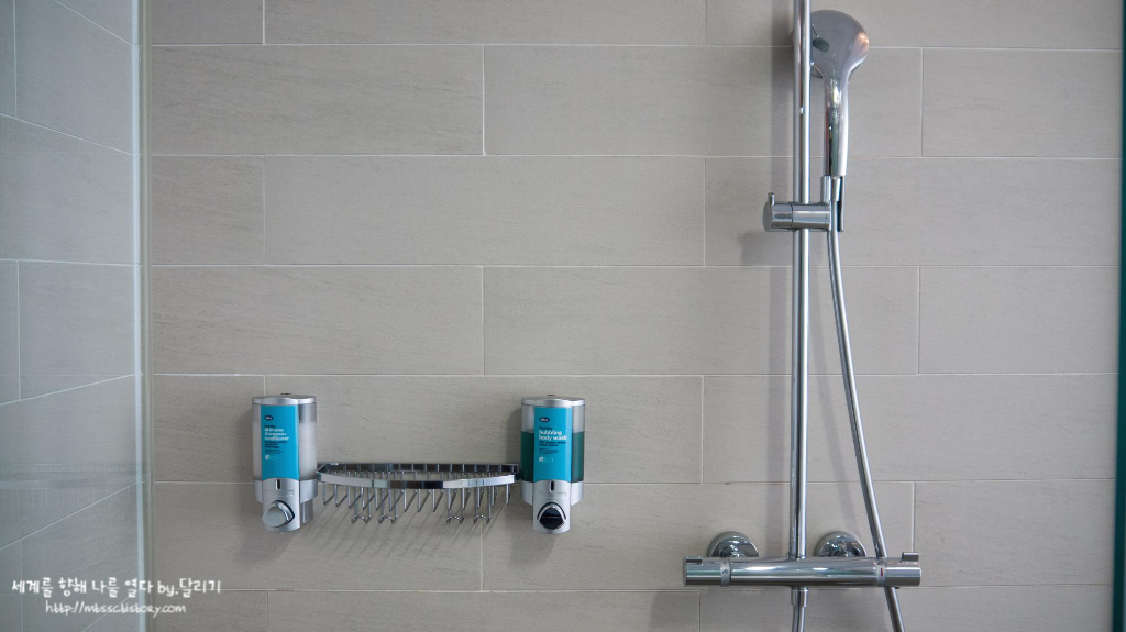 욕조는 따로 없고 샤워 부스가 마련되어 있습니다. 샴푸+린스 그리고 바디 워시는 일회용이 아닙니다. 이걸 아쉬워할 수도 있는데, 환경 보호 차원에서 앞으로는 일회용 어메니티가 점차 사라진다고 하니 이게 더 익숙한 모습이 되지 않을까 싶습니다.