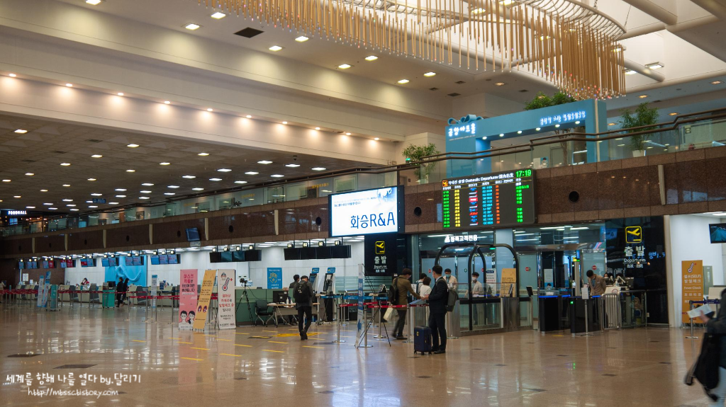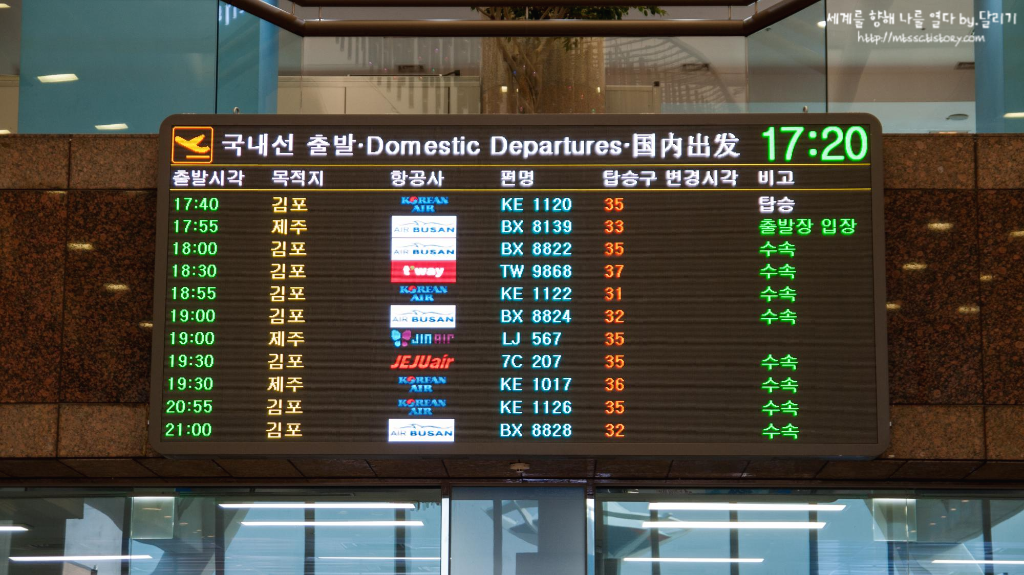 김해국제공항 국내선 출발 전광판 목적지가 김포, 제주밖에 없기는 하지만, 그래도 꽤 많은 항공편이 운항되고 있었어요.