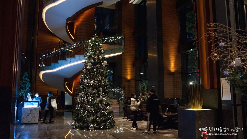 평일에 코로나 시국까지 겹치니 크리스마스 주간+연말 시즌이어도 로비는 비교적 한산한 편이었어요. 언제나 고급스러운 분위기가 마음에 드는 콘래드의 로비인데요. 크리스마스 시즌이 되니 큰 트리도 생겼고, 곳곳에 크리스마스 장식이 있어 연말 분위기까지 느껴져 더 좋았습니다.