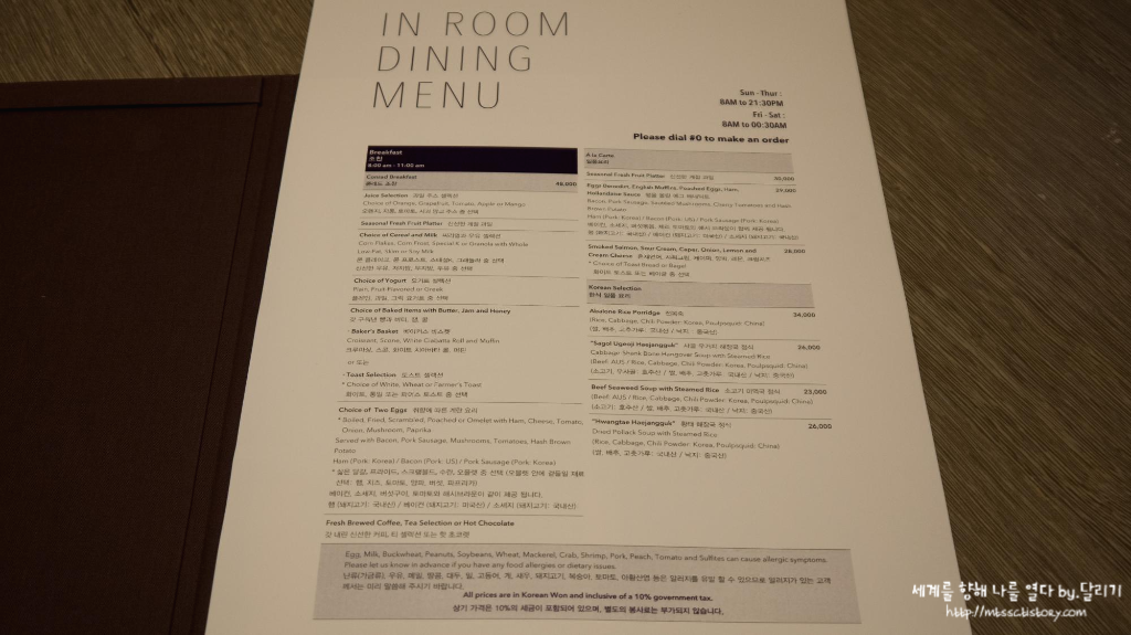 이 날은 먹지 않았지만 룸 서비스 메뉴도 한 번 찍어봤어요. 아직 올리지 않은 투숙 때 한 번 먹어본 적이 있는데, 음... 호텔 방에서 먹으니 호사스럽기는 했지만 맛은 쏘쏘~