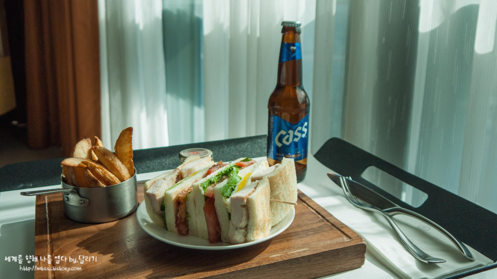 맥주는 라운지에서도 먹을 수 있지만, 방에서 마셔도 좋을 것 같아서 맥주를 골랐거든요. 침대에 누워 야경 보면서 마시니 퍽 괜찮았습니다 :D