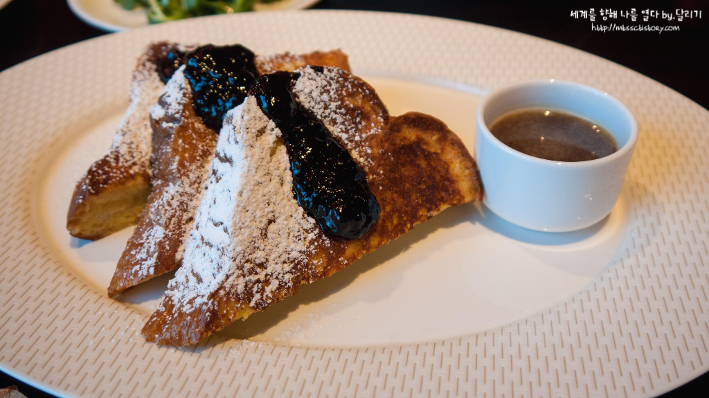 프렌치 토스트 굉장히 부들부들하고 촉촉한 토스트는 블루베리 잼과 메이플 시럽과 함께 나옵니다.