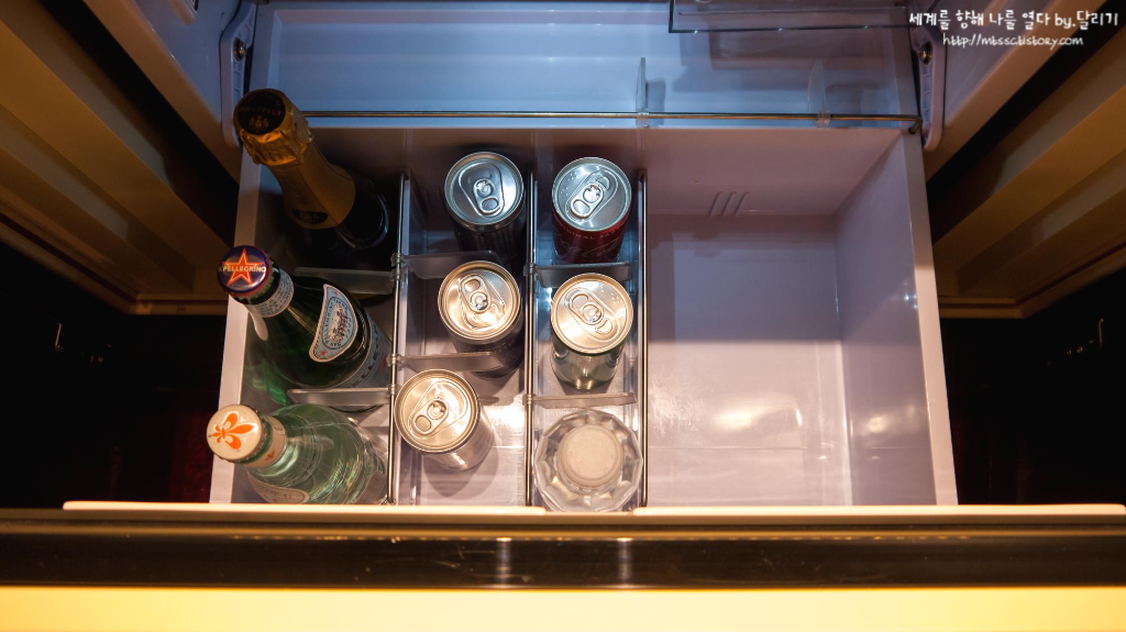 냉장고에는 와인과 음료 등이 있었습니다. 이 중에 가운데에 있는 캔 와인 3개와, 오른쪽에 있는 탄산음료 2개는 스위트룸 객실은 무료로 마실 수 있습니다 :)