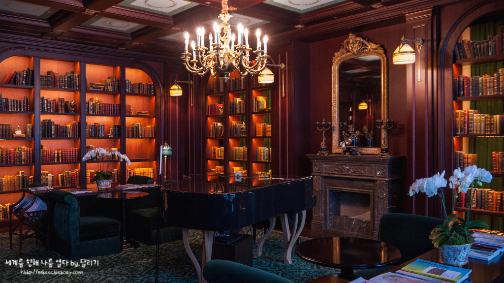 #라이브러리 라운지는 스위트 룸 투숙객 전용 이용 공간인데요. 파리의 살롱에서 영감을 받은 공간으로 굉장히 고풍스러운 분위기였어요.