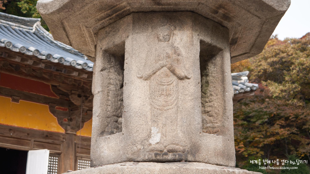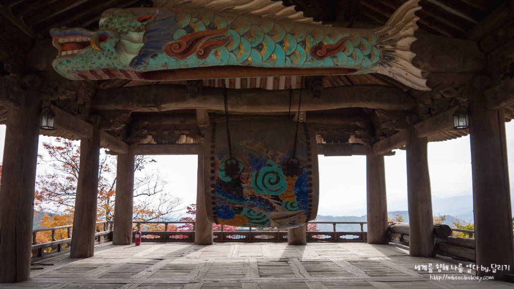 특히 회전문을 지나면 보이는 풍경이 참 아름다웠어요. 정면에는 높은 석단 위에 범종각이 높이 서 있고, 이를 중심으로 여러 전각들과 석탑 등이 배치되어 있는데요. 단정한듯 하면서도 우아한 자태에 넋을 잃고 서 있게 만들 정도였습니다. 알록달록 단풍에 물든 봉화산이 병풍처럼 감싸고 있으니 화려한 분위기까지 더해졌습니다.