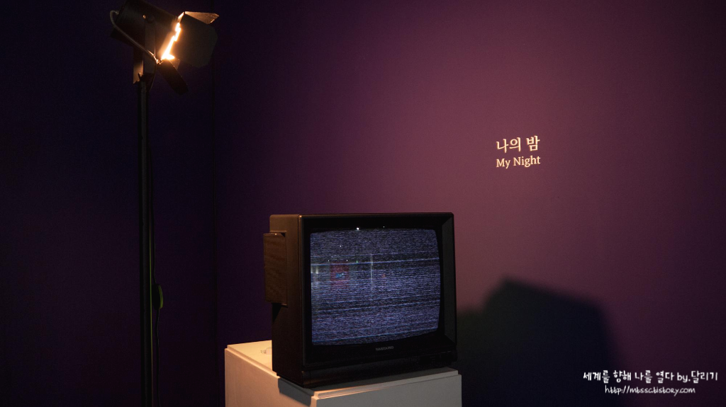 어두운 전시관 한켠에 있던 브라운관 TV와 나의 밤이라는 문구. 학창 시절 방학 때는 늦게까지 잠 안 자고 공중파 방송 끝날 때까지 TV를 볼 때가 종종 있었는데요. 지지직거리는 화면을 보니 그때 생각이 나더군요. 아무것도 나오지 않는 화면이지만, 뭔가 저를 추억 속으로 데려가는 느낌이었달까요?