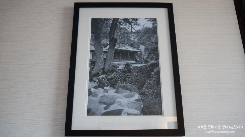 그래도 한옥이나 전통 문양 흑백 사진을 넣은 액자들은 일반 룸들과 똑같이 여기저기 걸려 있었어요. 개인적으로 한국의 고전미를 활용한 밀튼의 분위기를 좋아해요. 저는 서울 촌놈+한국인이지만(...) 이런 장식들이 있는 밀튼에 오면 서울 여행, 한국 여행 온 것 같은 기분이 들어 좋더라고요 ㅎㅎ