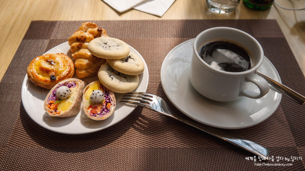 애프터눈 티 타임에는 간단히 빵과 쿠키, 그리고 음료와 커피 정도를 이용할 수 있어요. 옆에 보이는 주류들은 이용할 수 있는 것들이 아닙니닼ㅋㅋㅋ