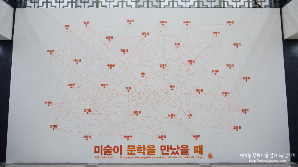 1층 로비에 들어서면 정면에 1930년대 이후 식민지 조선에서 다양한 예술 영역에서 활동했던 예술가들의 이름들이 보입니다. 서로가 많은 교류를 하면서 자신들만의 세계관을 구축해나갔던 것을 형상화한 듯, 이 예술가들의 이름은 많은 선들로 서로 연결되어 있었어요.