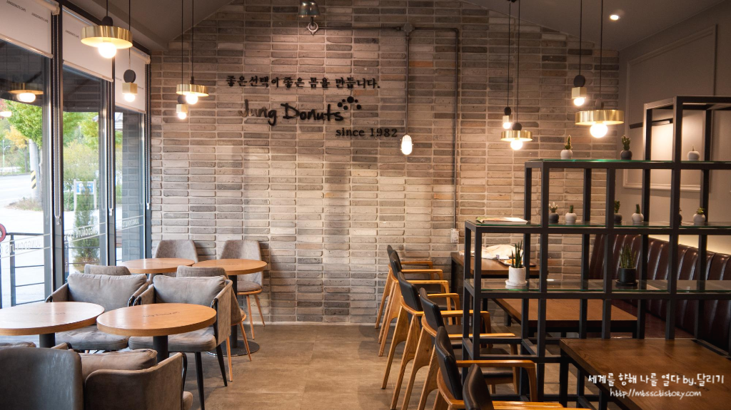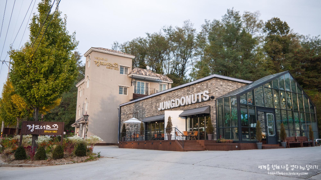 아무튼 걸어서, 정도너츠 본점에 도착! 읍내에서 살짝 떨어져 있어서 한적한 카페 분위기가 나는 곳이었습니다. 건물도 새로 지은 지 얼마 안 되었는지 시설도 좋아 보이고 예뻤어요.