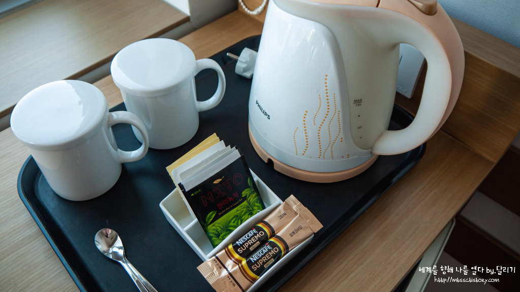 창가 바로 앞에 작은 책상이 있었고, 여기에 간단히 티백과 인스턴트커피가 구비되어 있었습니다. 생수는 두 병 제공이 되었는데요. 센스 있게 책상 아래에 있는 냉장고에 들어있었어요.