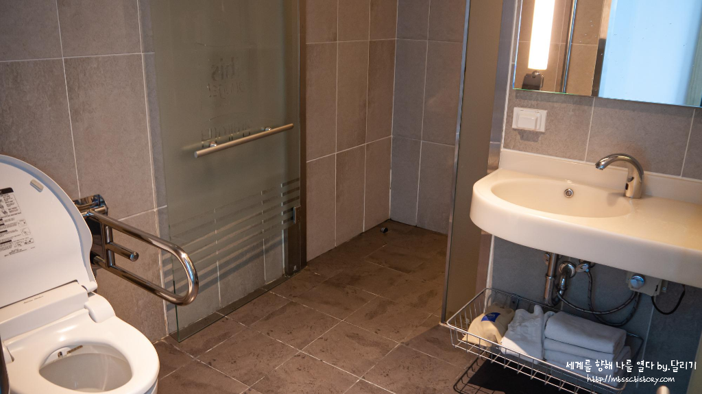 제가 묵은 방은 이비스 버젯 해운대 호텔의 가장 최고층인 15층에 있었어요. 그런데 객실 문 옆에 붙어 있는 객실 번호를 보니 제가 이용한 객실은 장애인용 객실로 만들어진 듯했습니다. 그래서 스탠다드 룸보다는 넓고, 욕실도 이비스 버젯 특유의 좁음(...)과 단차가 없는 비교적 넓고 이동하기 편한, 쾌적한 방이었나 봐요.
