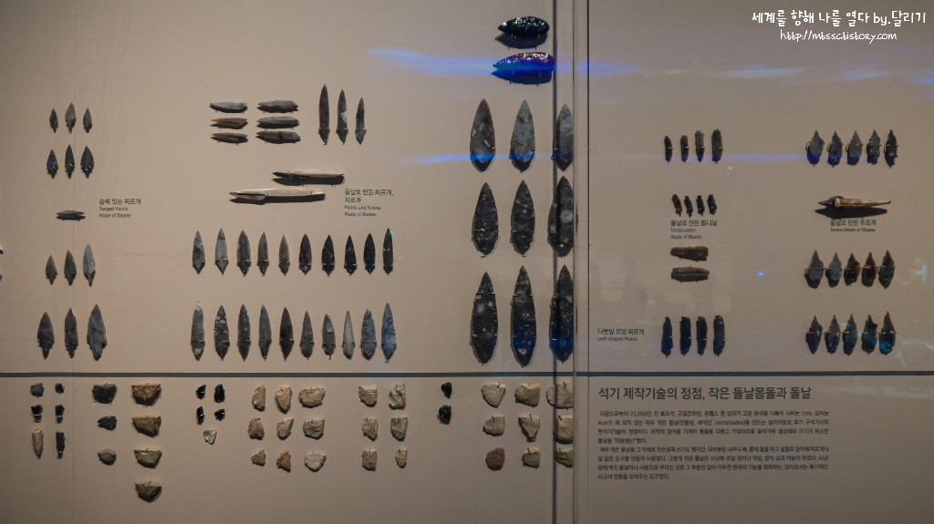 이어 구석기시대에 다양하게 제작된 석기들도 전시되어 있었습니다. 초기에 단순하게 떼어내서 만든 석기부터 몸돌에서 격지를 떼어내어 날카로운 도구를 만드는 르발루아 기술이 사용된 석기, 그리고 최종적으로 하나의 몸돌에서 수많은 격지(=돌날)를 양산해내는 단계에 이르기까지 전개가 되는데요. 시대순에 따라 석기들이 전시되어 있어서 석기 제작 기술이 점진적으로 발달하는 모습을 한 눈에 파악할 수 있었어요.