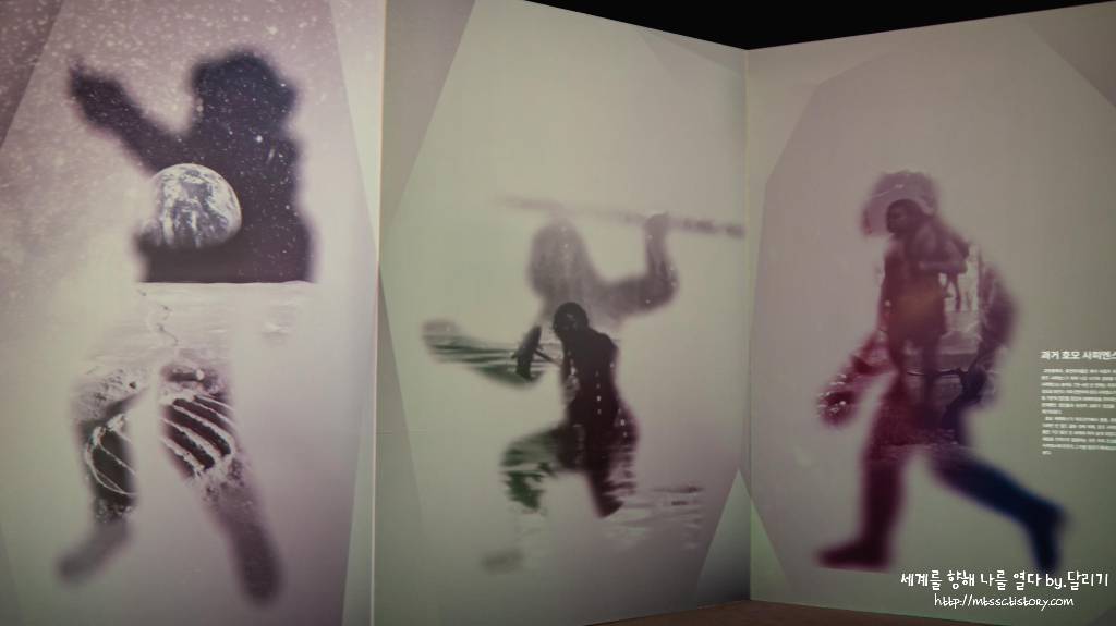 전시관 입구의 역사적 인물들이 인간에 대해 정의를 내린 문구들을 지나치면 거대한 스크린 5개가 있는 공간에 서게 되는데요. 각각의 스크린 앞에 설 때마다 고인류와 관련된 영상들이 재생이 됩니다.
