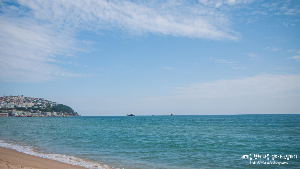 먼저 해운대 해수욕장부터 걷기로 했는데요. 호텔에서 도로 하나만 건너면 바로 해수욕장이 나와서 참 좋았습니다. 이 날은 맑으면서도 그렇게 덥지도 않고 선선한 바람이 불어 걷기에 참 좋았습니다. 평일이라 해수욕장에 사람도 많지 않아 한적해서 더 좋았고요~ 그래서 그냥 편안하게 해변 산책을 했어요 ㅎ