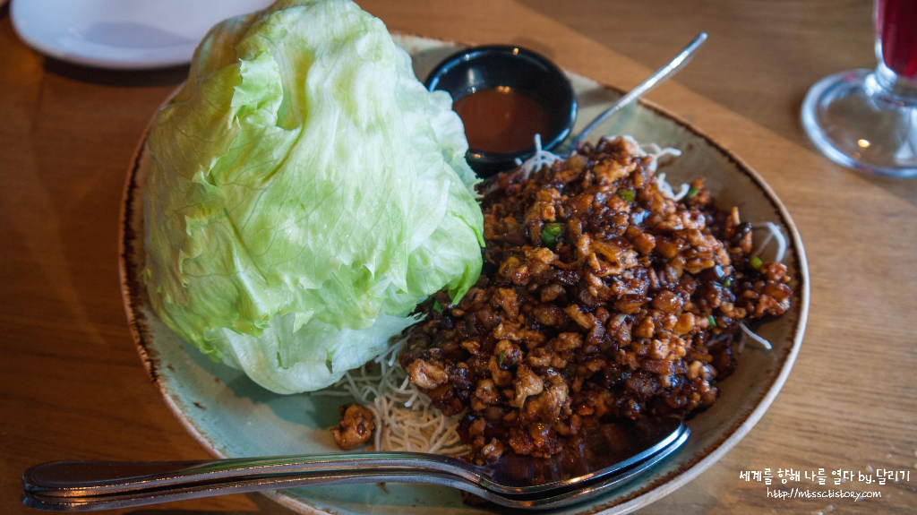 다진 닭고기와 버섯 등을 볶은 소스와 튀긴 라이스 스틱을 양상추에 싸서 먹는 요리인데요. 저 볶은 녀석들이 짭쪼롬하니 맛있고, 양상추도 싱싱해서 아삭하니 정말 맛있었어요. 저희 엄마가 무척 좋아하셨습니다 ㅎㅎ