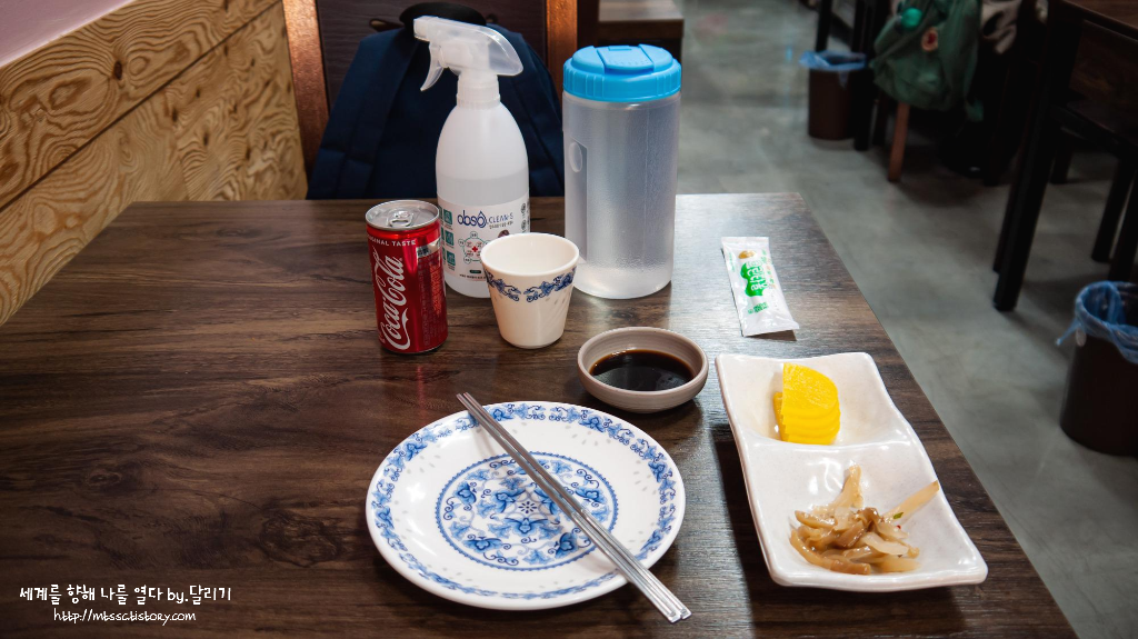 주문이 들어간 후 기본 찬과 접시를 가져다주십니다. 기본 찬으로는 짜사이와 단무지가 나왔고요. 코로나 때문에 소독약도 같이 주셨어요 ㅎㅎ