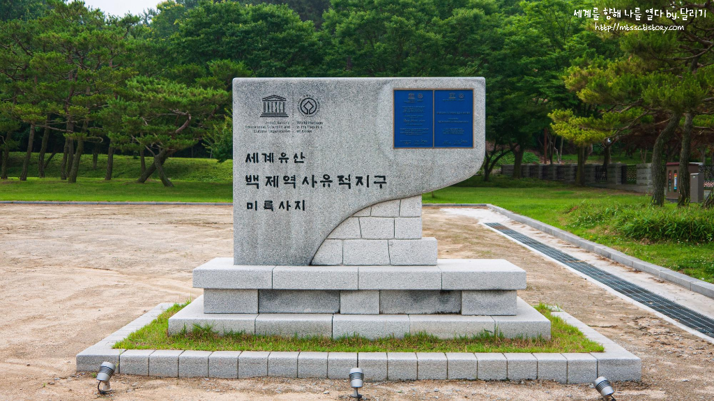 절터 앞에는 이곳이 세계유산으로 지정되었음을 알리는 비석이 하나 세워져 있습니다. 2015년, 익산의 미륵사지와 왕궁리 유적은 공주, 부여의 백제 유적들과 함께 '백제역사유적지구'라는 이름으로 유네스코 세계유산에 등재되었습니다.