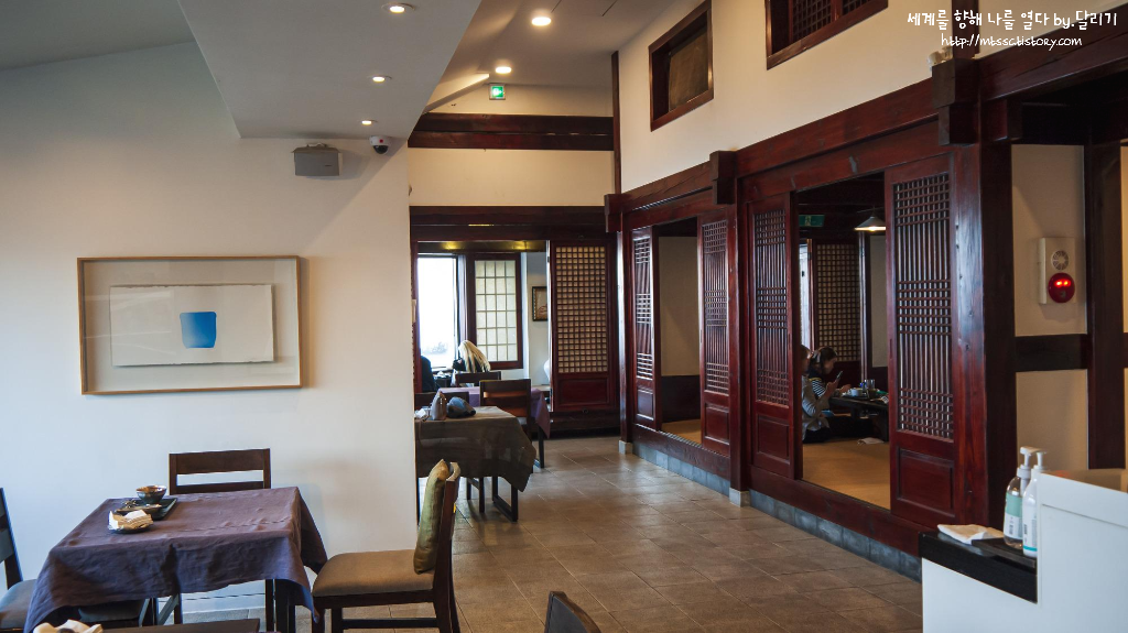 내부는 전통 한옥 컨셉으로 꾸며져 있어서 고풍스러움이 묻어납니다. 공간도 적당히 넓은 편인 데다가 좌석 간 간격도 꽤 넓은 편이라 손님이 많았는데도(사진은 손님들이 빠졌을 때 빠르게 찍은 것) 여유로운 분위기였어요.