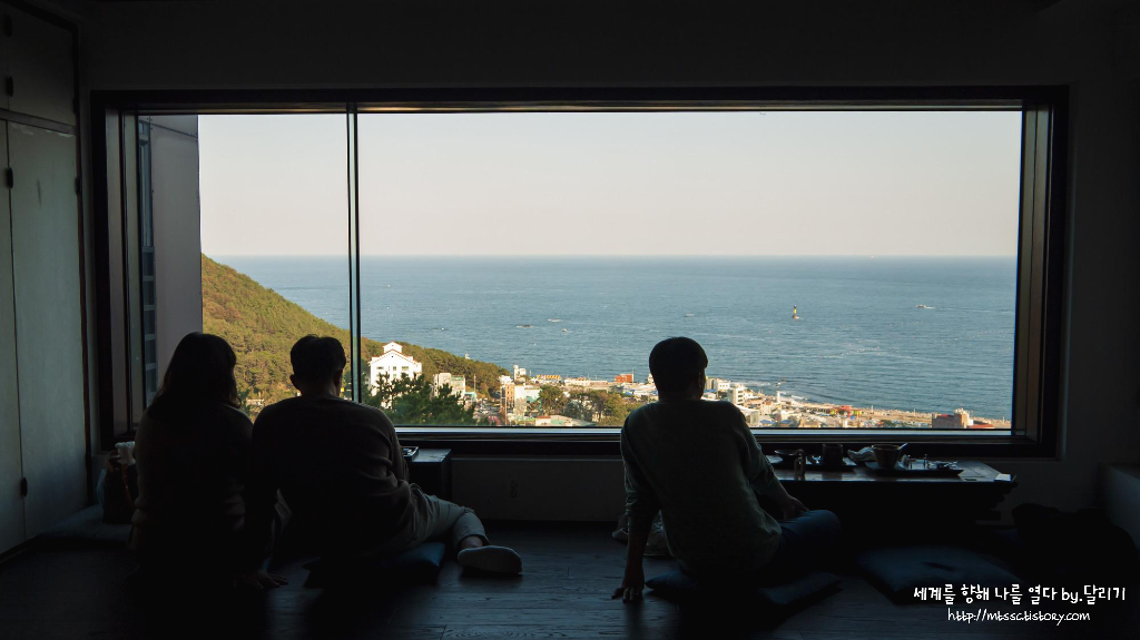 무엇보다도 좋은 점은 높은 곳에 위치하고 있어서 전망이 아주 좋은데요. 창너머로 청사포와 부산 앞바다 풍경이 아주 시원하게 펼쳐졌습니다.