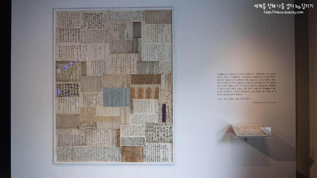 다른 벽면에는 옛 사람들이 주고 받았던 다양한 서간(書簡)들이 한가득 붙어 있었습니다. 그 옆으로 단독으로 전시 중인 서간은 추사 김정희가 적은 것으로 승하한 임금 헌종에 대한 그리움과 가족에 대한 걱정, 그리고 자신의 안부를 전하는 내용이 담겨 있었습니다.
