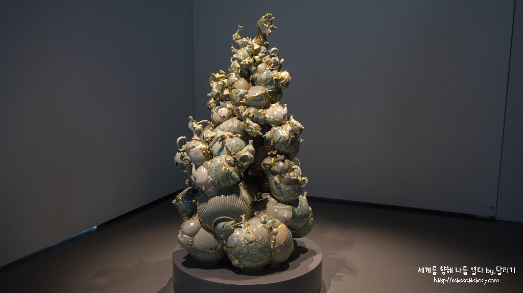 버려진 도자기 조각들은 말 그대로 버려지는 것들이라 평소에는 관심 있게 보지 않았을 텐데, 이렇게 금으로 연결시켜 하나의 오브제로 만들어 놓으니 독특하면서도 화려하여 꽤 인상적이었고요. 작가의 해석을 통해 전통적인 도자기와 새로운 방식으로 소통한다는 느낌이 들어 신선함도 느낄 수 있었습니다.