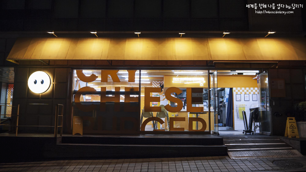 가게 이름에서 알 수 있듯이 수제 치즈버거를 파는 곳이며, 귀엽게 우는(?) 치즈버거 형상으로 노란 마스코트를 만들어 사용하고 있기도 해요. 가게 내부도 노랑노랑해서, 전체적으로 띠드버거(...)의 분위기를 느낄 수 있습니다.