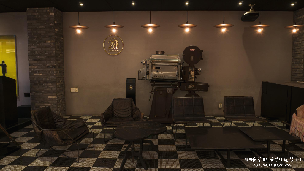 호텔 28 명동은 특별히 레트로 감성의 영화를 컨셉으로 하는 부티크 호텔이에요. 그래서 호텔 곳곳에 고전 영화의 이미지 컷이나 오래된 카메라 등의 소품들이 배치되어 있어요.