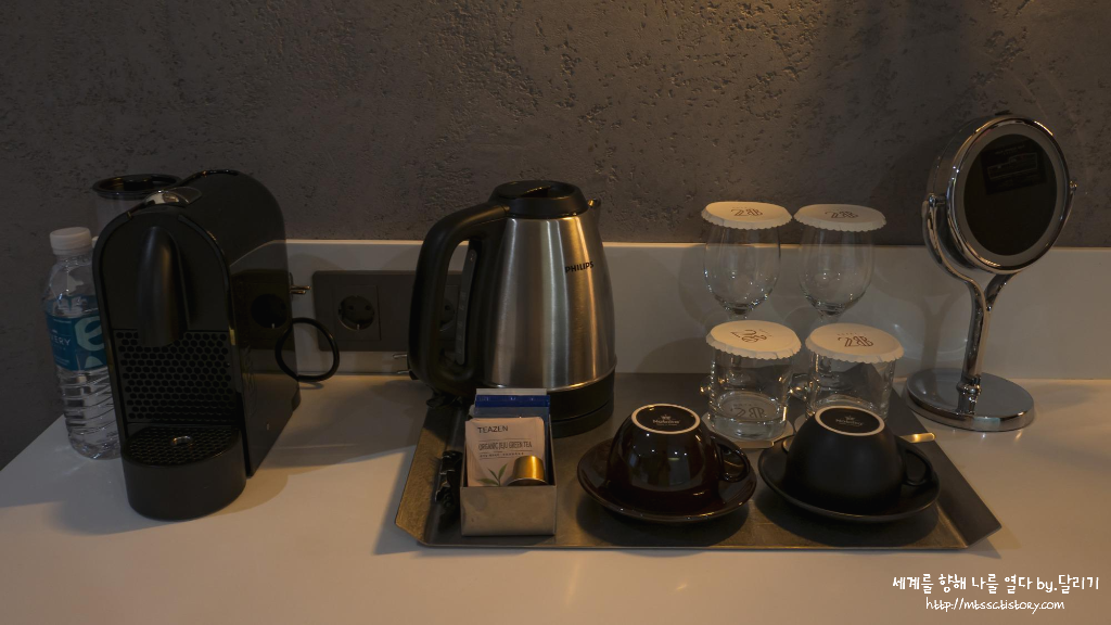 캡슐 커피는 디카페인 1개를 포함하여 3개가 준비되어 있고, 그 외에 티백들과 생수 3병도 있었어요. 유료 미니바는 따로 운영하고 있지 않았습니다.