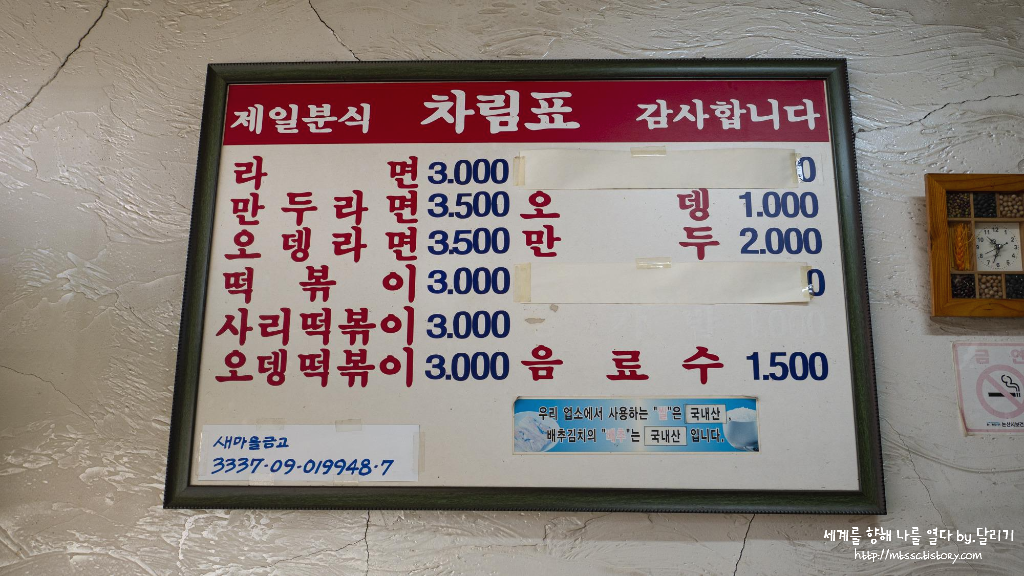 세월의 흔적은 메뉴판에서도 느낄 수 있었어요. 오래되어보이는 '차림표'에는 떡볶이와 라면, 오뎅과 만두가 있었는데요. 가격 올린 흔적이 보이는데도 가격이 정말 착해요.