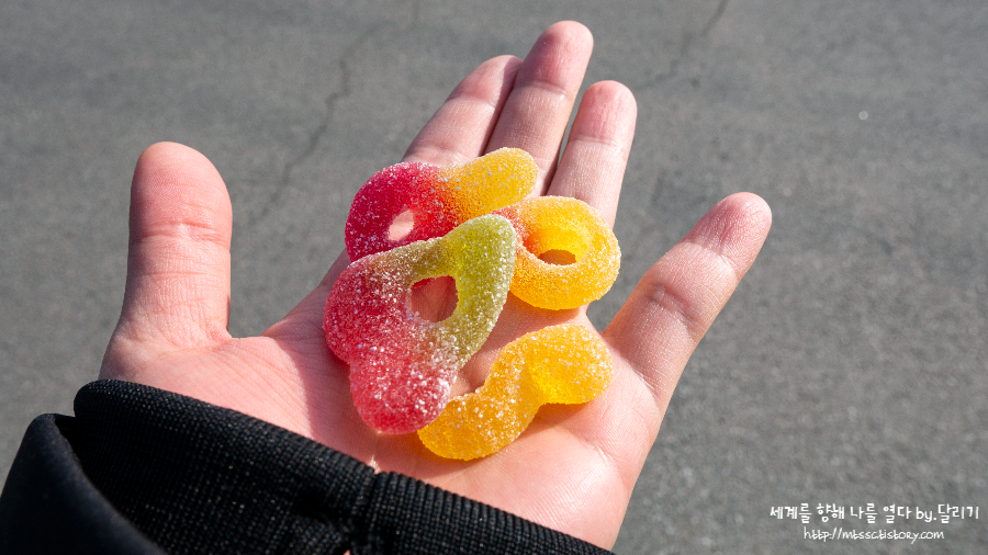 버스에서 내려서 관촉사로 걸어가는 동안, 아까 역 앞 편의점에서 사둔 하리보 젤리를 꺼내 먹습니다 ㅋㅋㅋ 고등학교 동창인 친구와 여행왔더니, 뭔가 소풍 온 기분이 들었습니다 :)