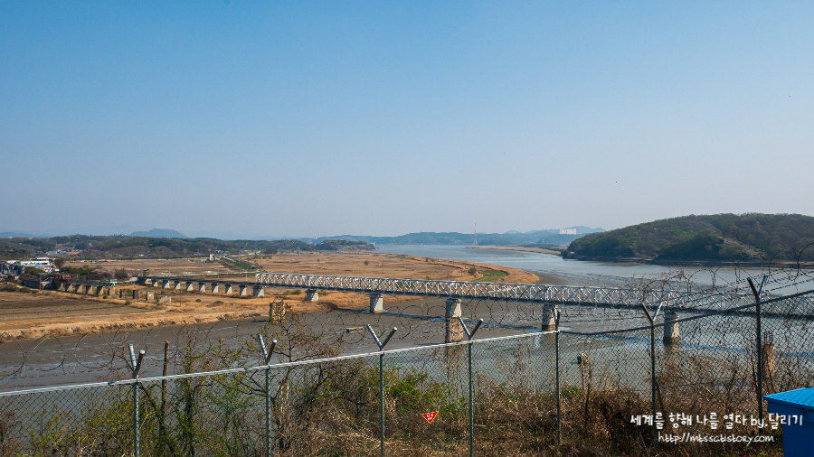 전망대로 나아가 보면 서해로 흘러가는 임진강과 강을 가로질러 가는 임진강 철교가 눈에 들어옵니다. 임진강 철교는 본래 복선 철교였으나 6.25 전쟁 중에 둘 다 파괴되었는데요.