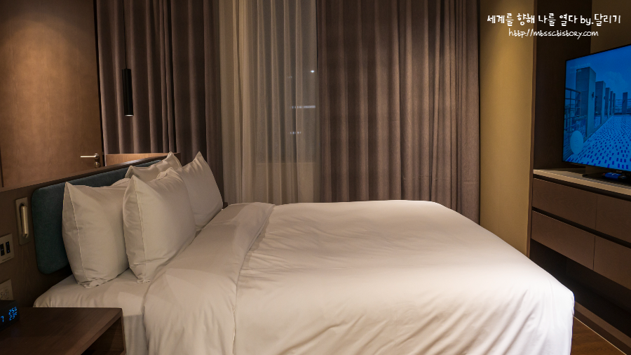 침실은 공간이 넓은 편은 아니었으나, 침대는 커서 친구랑 둘이 자도 불편함이 없었고요. 침대 뒤에 붙어있는 탁자도 짐 올려놓기 딱 좋아서 편하게 이용했습니다.