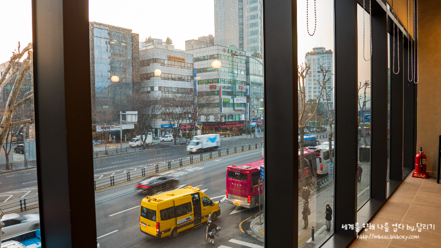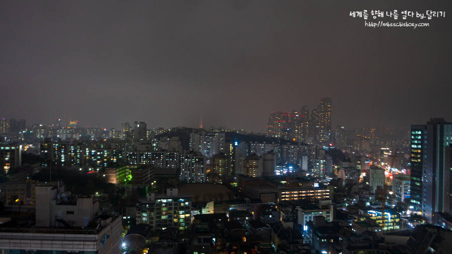 침실 창문에서 본 뷰는 요렇습니다. 도곡동 방향의 뷰인데요. 저 멀리사우론의 눈롯데 타워도 보입니다. 뷰는 딱히 좋은 것은 아니었으나 저층 뷰에 비하면 훨씬 좋습니다.참고로 저층 객실의 경우 병원 광고가 너무 정면에 보이는 뷰