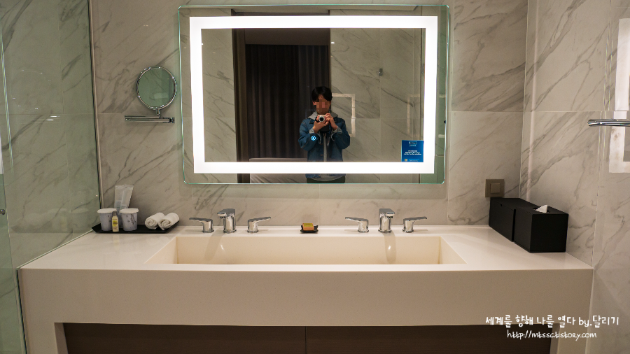 세면대에 수도꼭지를 두 개 달아두었으니 세면대를 양쪽으로 구분해서 설치하면 더 좋았을 텐데 큰 거 하나로 설치를 해서 고건 좀 아쉬웠어요.객실 소개는 여기까지입니다. 2박 3일 동안 지내기에는 정말 편안하고 좋은 객실이었어요. 무엇보다도 10만 원 초반에 기본 객실 예약해서 업그레이드를 받아 이용한 것이니 더더욱 감사했답니다 ㅎㅎㅎ