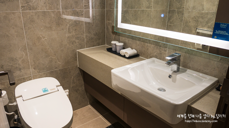 객실 입구쪽에는 게스트용 화장실이 따로 있어요. 침실 옆에 욕실이 있어서 혼자 갔다면 별 쓸모가 없는 공간이지만, 친구와 함께 투숙해서 화장실이 두 개인 건 참 좋았답니다 ㅎㅎ