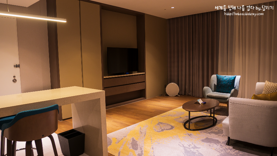 소파 앞 테이블에는 웰컴 레터와 초콜릿이 미리 준비되어 있었습니다. 별 거 아니지만 제 이름 석자 새겨진 레터가 놓여 있으면 환영받는 느낌이 듭니다 ㅎㅎ 이 방은 나를 위해(?) 준비된 방이라는 고런 느낌...?