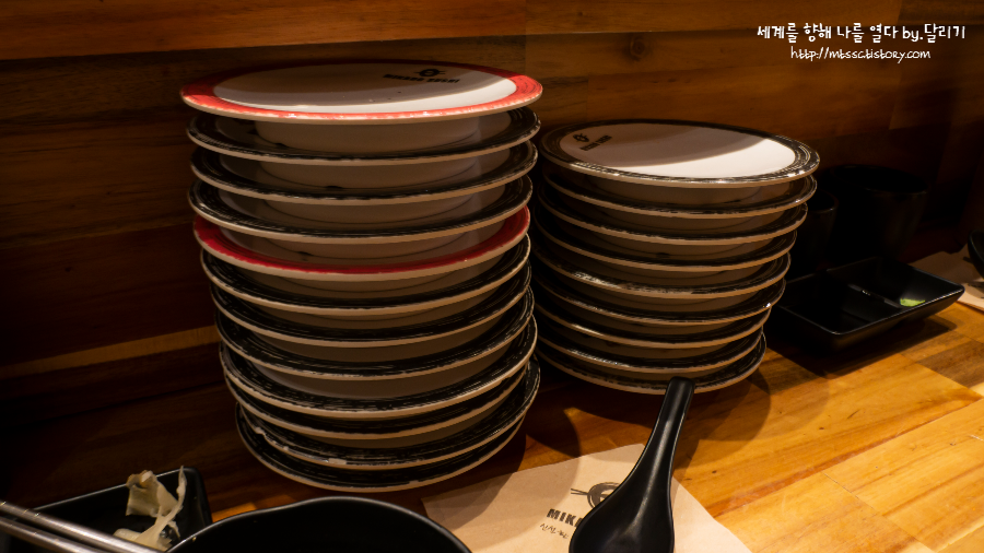 가격은 접시당 ₩1,900인데, 빨간 접시들만 ₩3,800이에요. 가격 종류가 단순해서 먹으면서 계산하기는 쉽습니다 ㅎㅎ