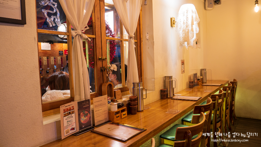 식당 내부는 사실 그렇게 넓지는 않은 편이었는데요. 중앙 공간에는 다인용 테이블이 여럿 있었고요. 창가 벽쪽으로는 혼자서 식사할 수 있는 공간도 마련되어 있었습니다. 저희는 셋이 가서 중앙에 있는 테이블석으로 자리를 안내받았습니다.