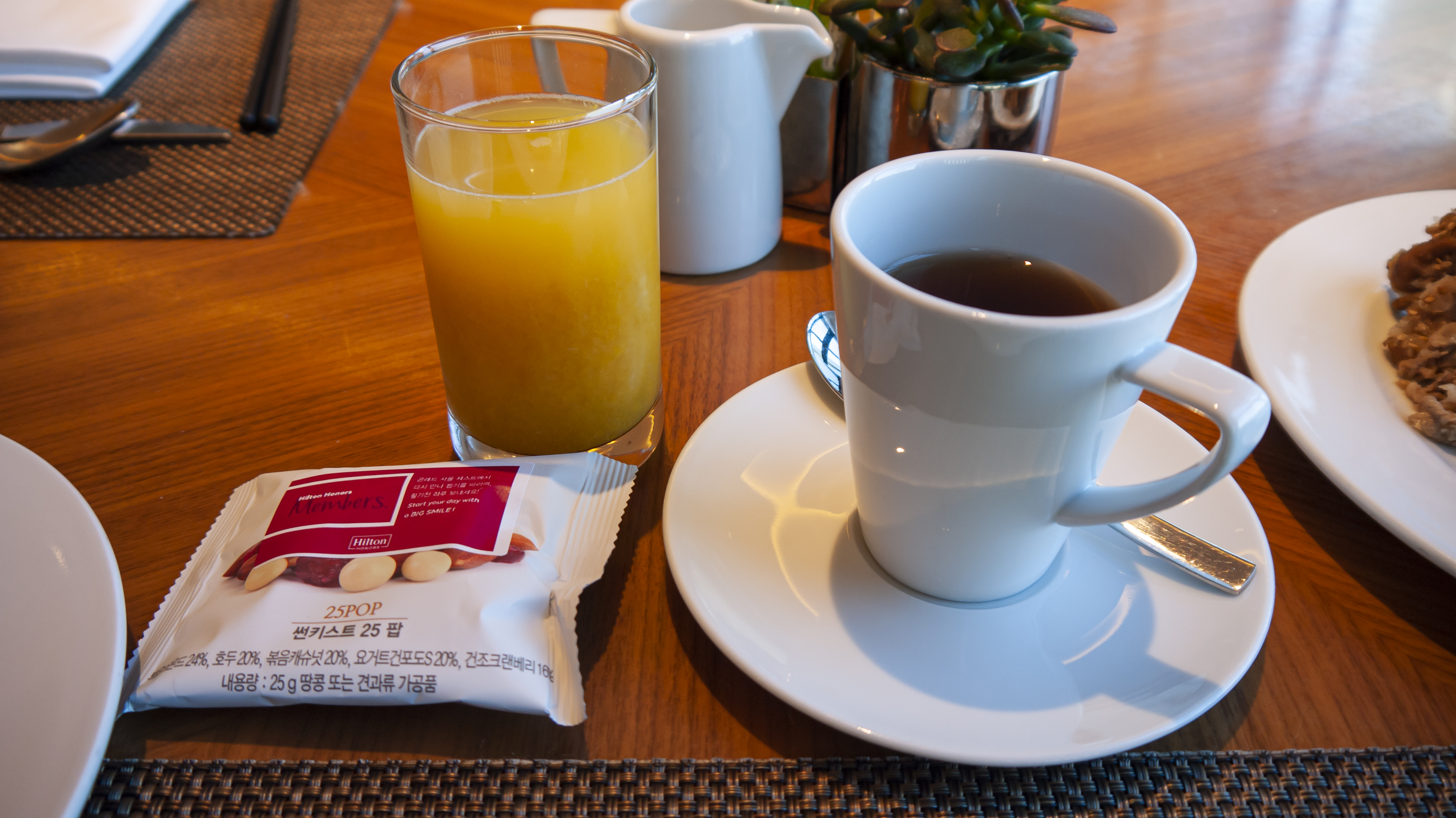 망고 주스는 가져온 거고, 홍차는 자리에 앉을 때 직원 분이 주문받고 가져다주셨고요. 견과류는 힐튼 아너스 멤버라서 챙겨주는 거래요.