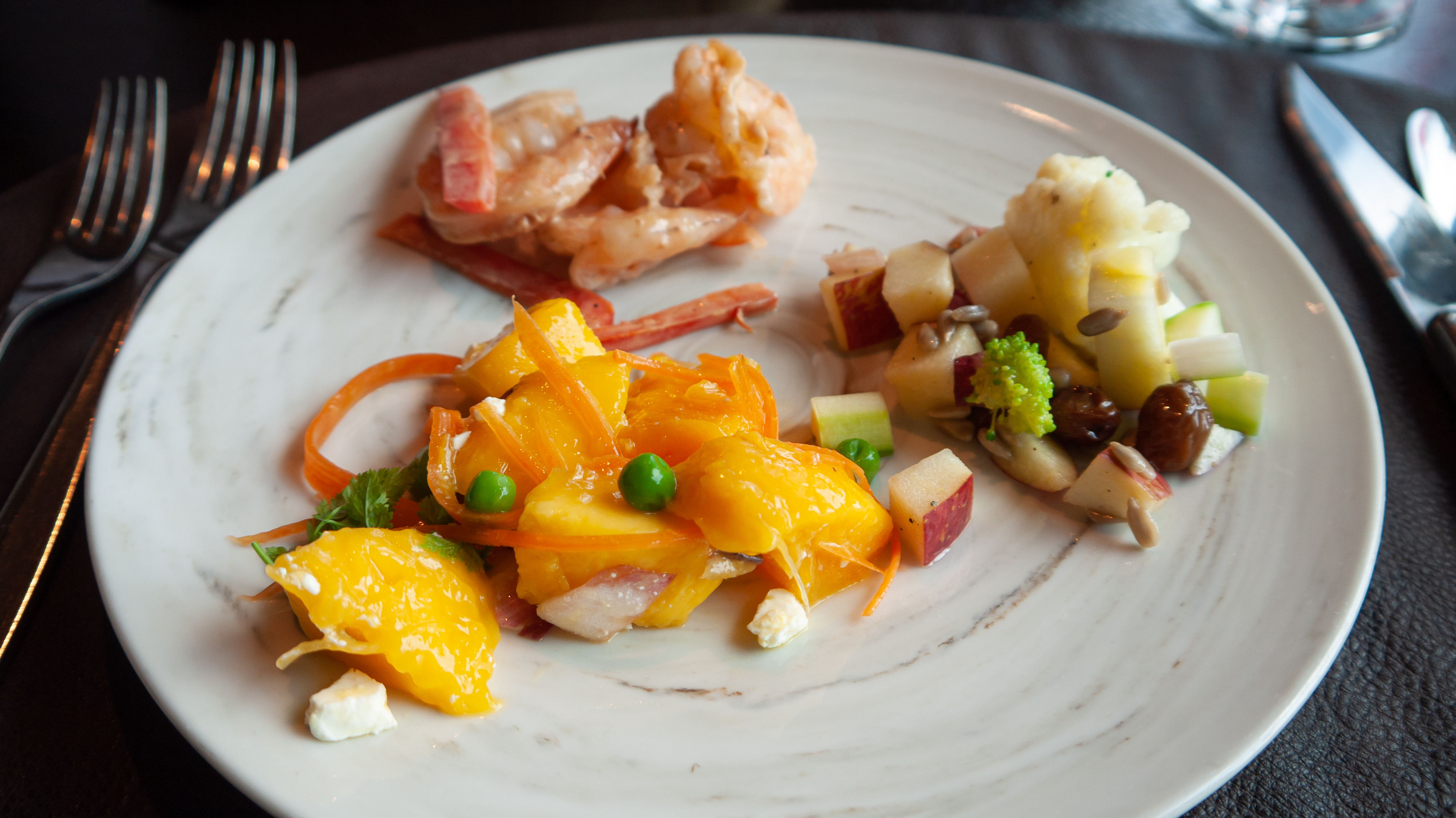 다른 거 많이 먹으면 뒤에 나올 음식을 제대로 못 먹을 것 같아서 샐러드 3종만 조금씩 퍼와서 먹었어요. 재료도 신선하고 간도 너무 세지 않고 적당하니 맛있었어요.